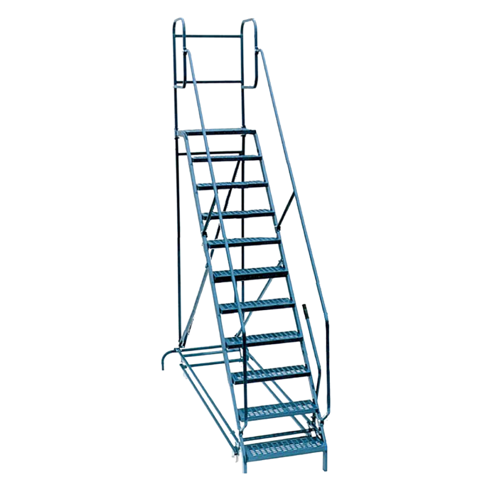- Pull-n-roll lever system raises the ladder on four wheels to easily move the ladder.