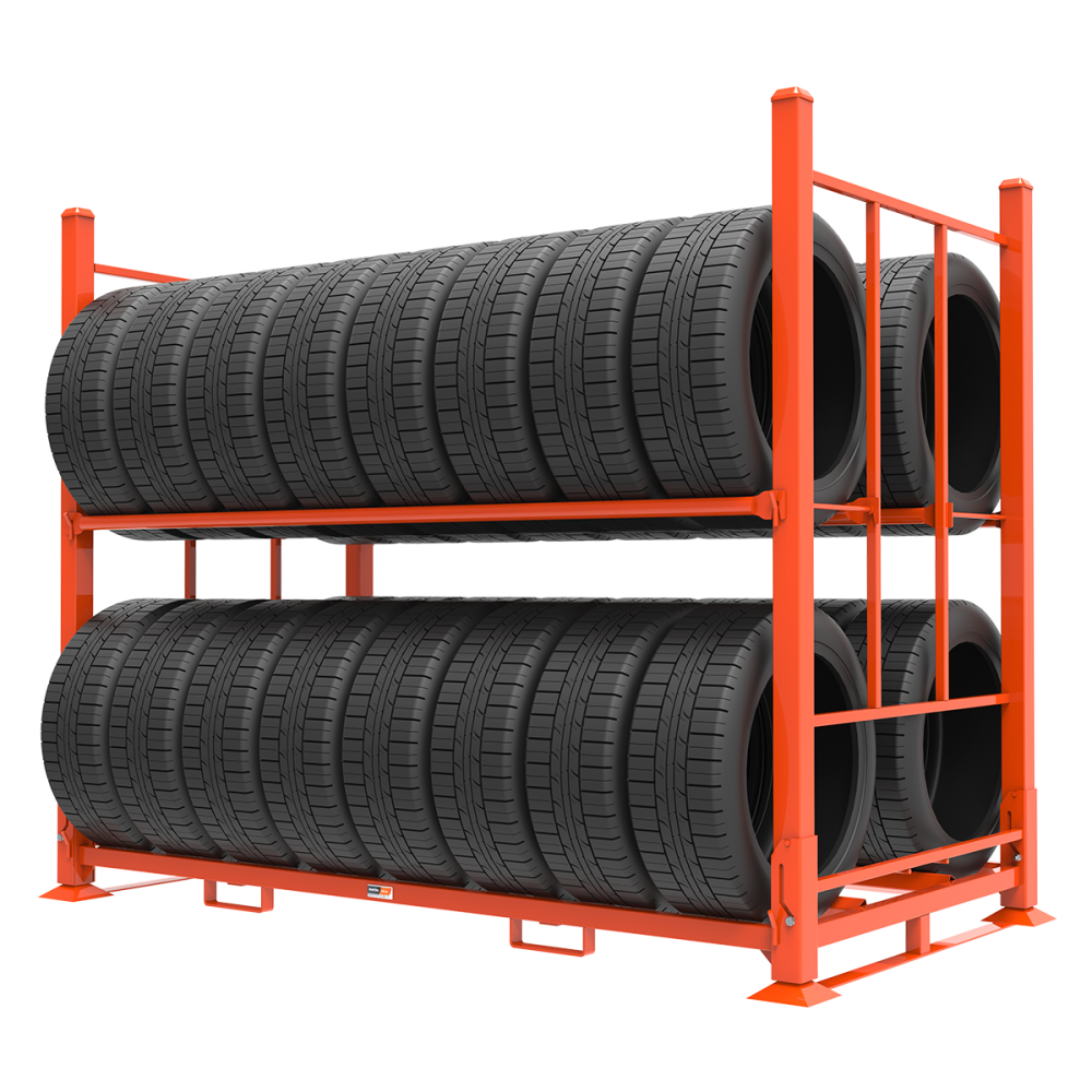 El palé de neumáticos apilable y plegable puede almacenar neumáticos de SUV y camiones ligeros sobre su banda de rodamiento. Compatible con el AVEX AT 424, el ARCOM AR04, el Gebhardt TR-ST-11 y el TR-EC-14, entre muchos otros modelos de palés de almacenamiento de neumáticos. Puede usar las barras transversales proporcionadas para obtener 4 filas (2 de altura por 2 de profundidad) de neumáticos de hasta 80 cm de diámetro exterior fácilmente accesibles. Gracias a la soldadura robótica puede confiar en la solidez y durabilidad de este estante. Sus guías de horquilla permiten una extracción adecuada con la carretilla. Cuando esté vacío, simplemente pliegue ambos lados y apile hasta 20 MER-505 para ahorrar espacio.