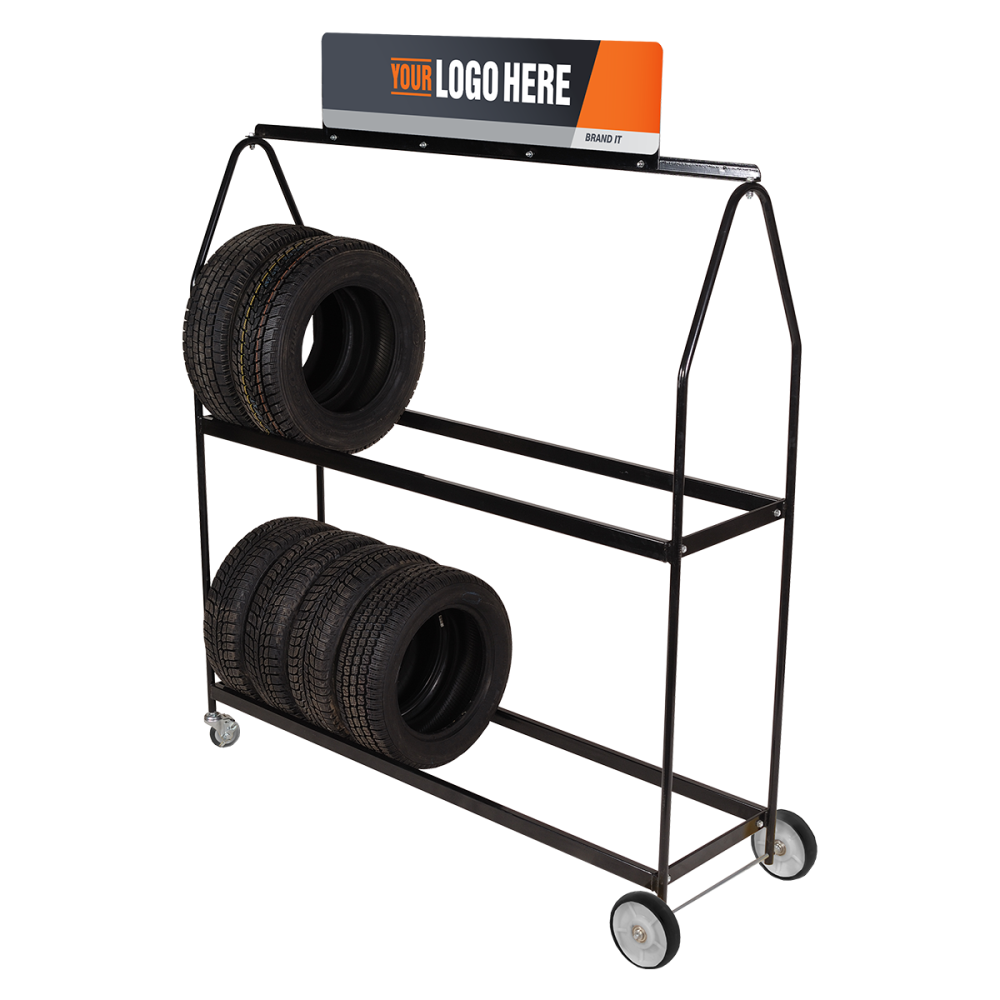 Augmentez votre visibilité, montrez vos meilleurs vendeurs ou vos pneus usagés avant même que le client n’entre dans votre garage. Ses roues fixes et pivotantes avec frein permettent une grande mobilité; vous pouvez ainsi placer aisément le présentoir ou le faire rouler à l’extérieur de votre garage. Élégant et robuste, le Présentoir mobile pour pneus se démarquera davantage avec un en-tête personnalisé qui affiche le logo de votre entreprise*. Il suffit de fournir à votre imprimeur local votre logo haute résolution avec notre modèle de plaque d’affichage.